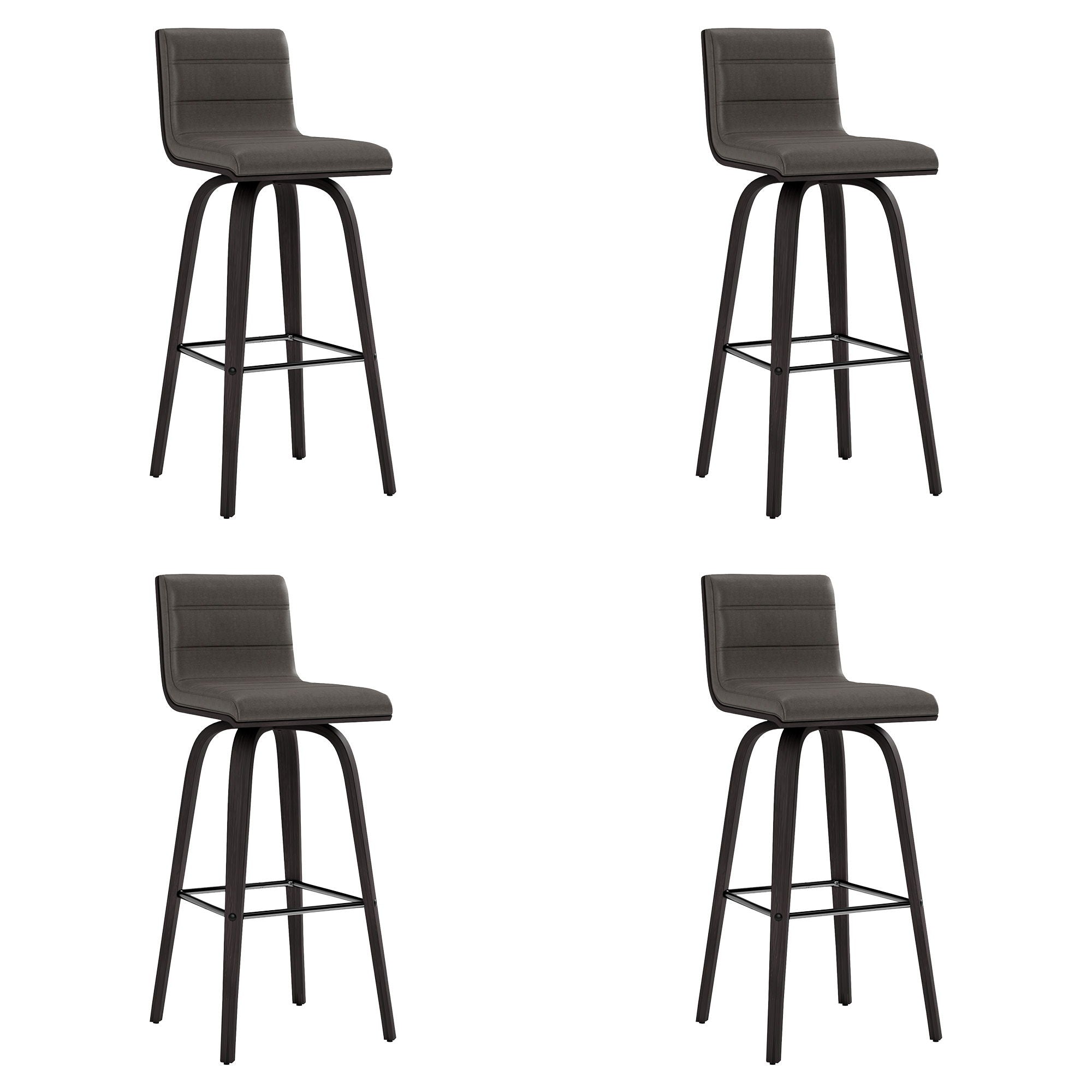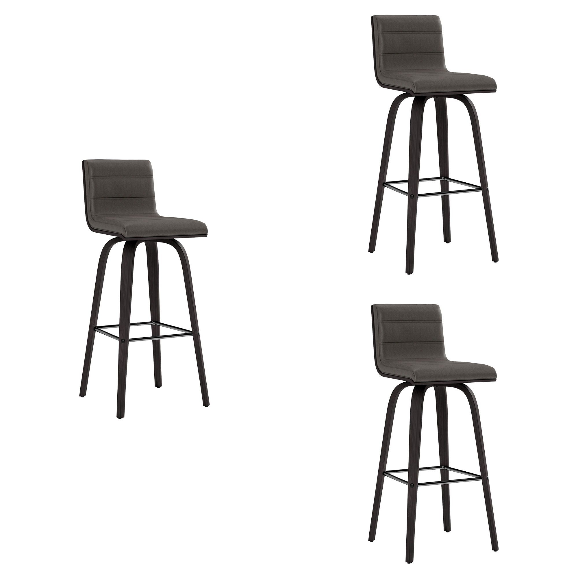 Elevate your space with the classic and sophisticated Vienna Swivel Faux Leather and Wood Counter or Bar Stool by Armen Living. This sleek and versatile barstool seamlessly combines style and comfort with its Mid-Century Modern design, effortlessly integrating into your home's existing decor. With the 360-degree swivel function, you and your guests have optimal mobility for staying engaged, regardless of your place in the room at any party and gathering. The sturdy frame is constructed with four robust wooden legs, elegantly accentuated by a plush, high-density foam cushion enveloped in high-grade faux leather upholstery. A square, steel footrest adds a touch of chic style without compromising practicality. The soft faux leather upholstery makes the Vienna and ideal choice for any entertaining home! With its two seat height options and armless design, you can the Vienna easily complements your kitchen island, peninsula counter, or home bar. The padded backrest, designed with ergonomic properties, ensures both comfort and proper alignment during use. Ideal for any home or apartment, the Vienna promises enduring comfort with its quality materials, guaranteeing a stylish and comfortable seat for years to come. Choose from the Vienna Counter or Bar Stool in 26” or 30” seat height, available in either a black wood finish with gray faux leather or a walnut wood finish with cream, gray, or brown faux leather to suit your individual taste and enhance your space.