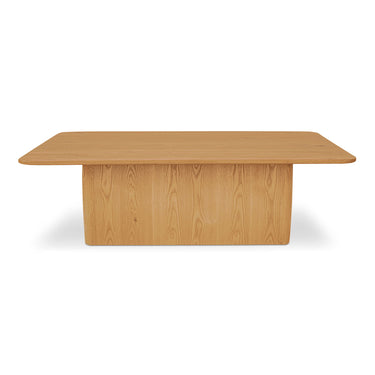 The Winston coffee table's commanding plinth base features softly rounded edges at all four corners, offering a hefty, substantial design poised to be the centerpiece of any space. Finished in a rustic oak veneer with expressive knots highlighting the wood's natural charm, it crafts a striking contrast between old and new.